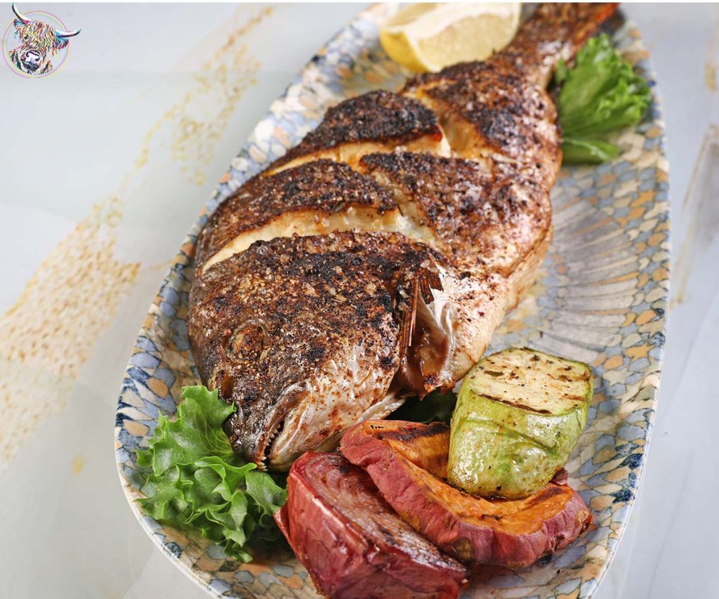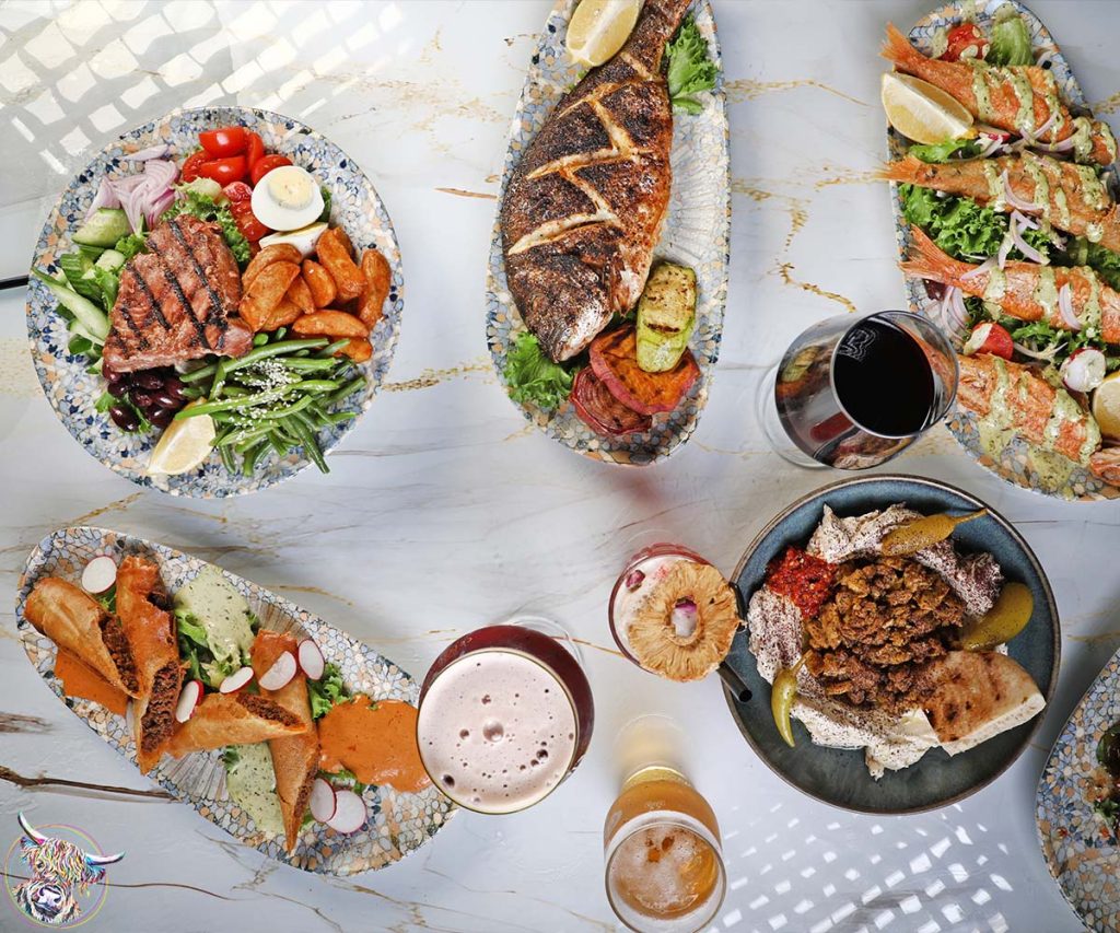 מטבח שף כשר עם בשרים, דגים ומנות עשירות מול נוף פתוח לחוף הקשתות – שילוב מושלם בין טעם, אווירה וים.